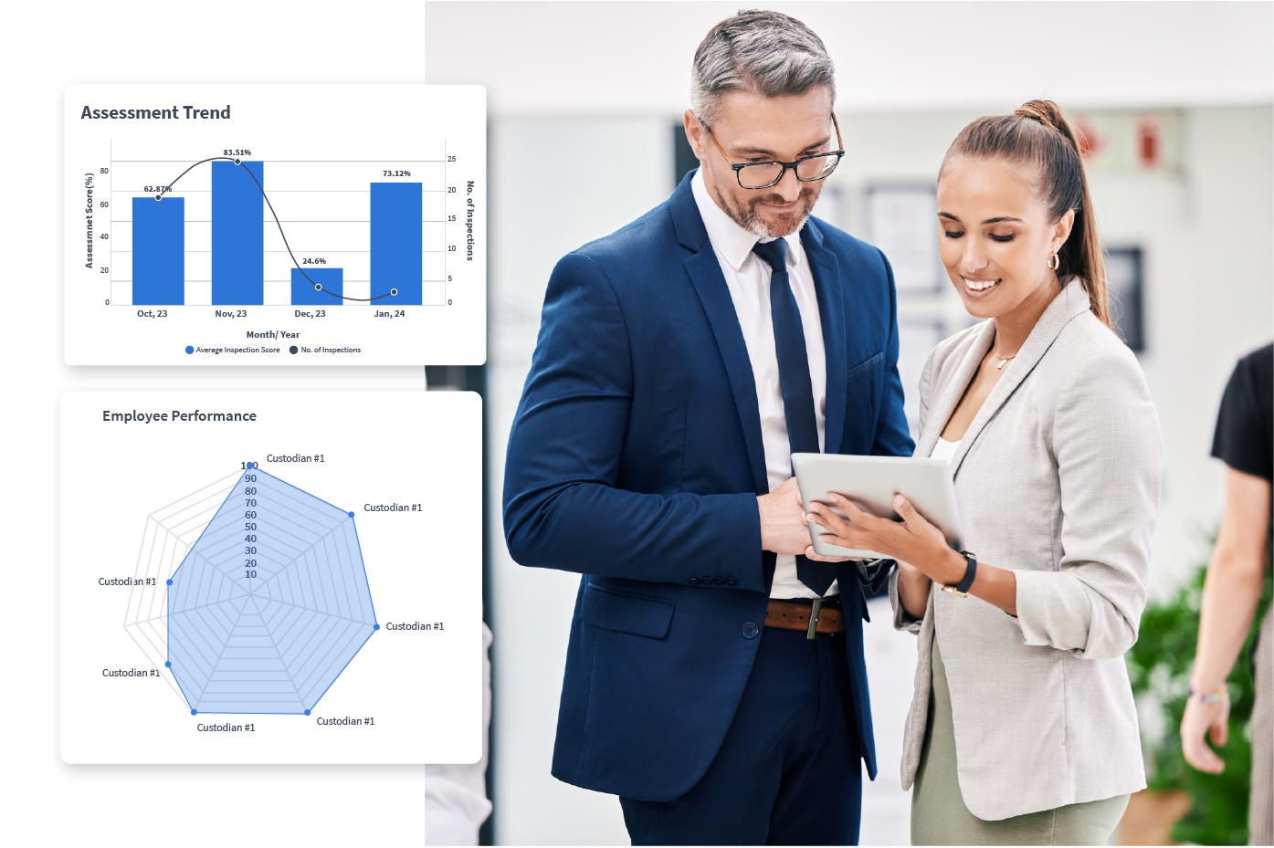 a woman is working on a laptop displaying a web page with various facility-related images for review or monitoring. Overlaid on the image are graphic elements showing complex data visualization: a bar graph labeled "Assessment Trend" detailing monthly inspection scores, and a spider chart titled "Employee Performance" comparing metrics for different custodians.