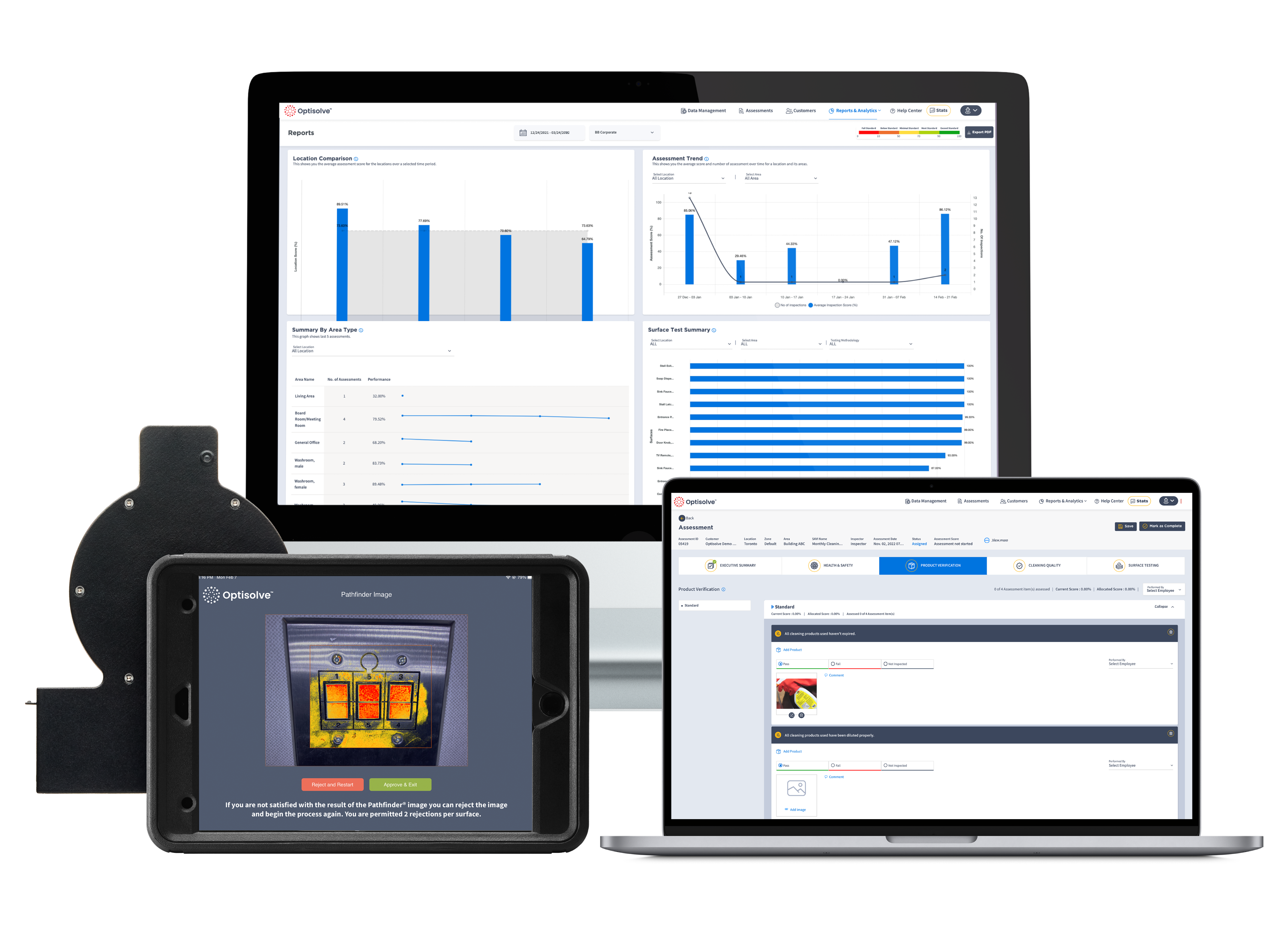 With Optisolve Pathfinder™ Surface Imaging Technology facility managers and cleaning teams have a powerful tool to assess surfaces for contamination. Pathfinder™ uses our SAVI software system to process the images. The results are provided in both digital dashboards and PDF report formats.
